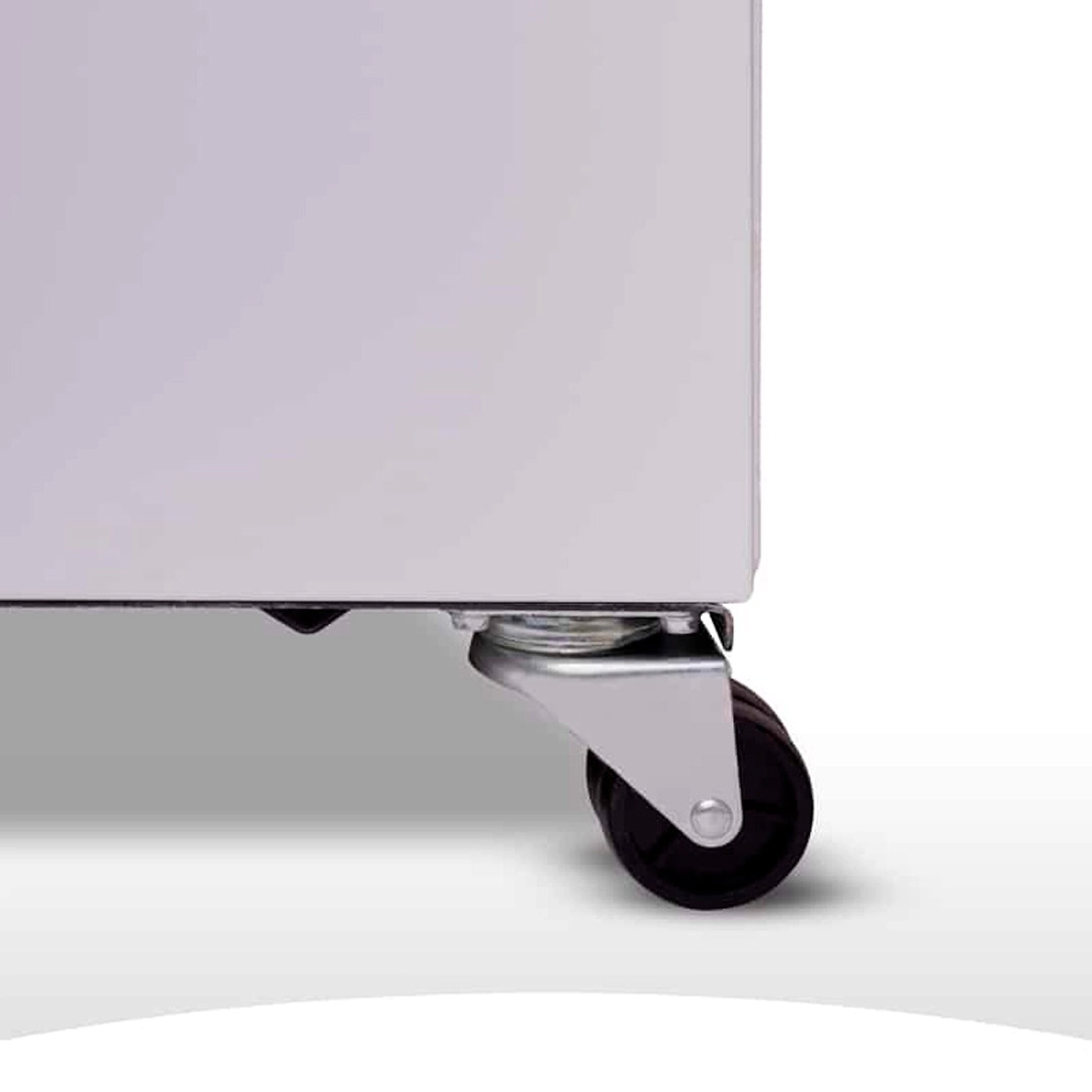 Exhibidor Horizontal con Tapa de Vidrio Curvo. Plano Inclinado. Ruedas Giratorias de Alta Resistencia.