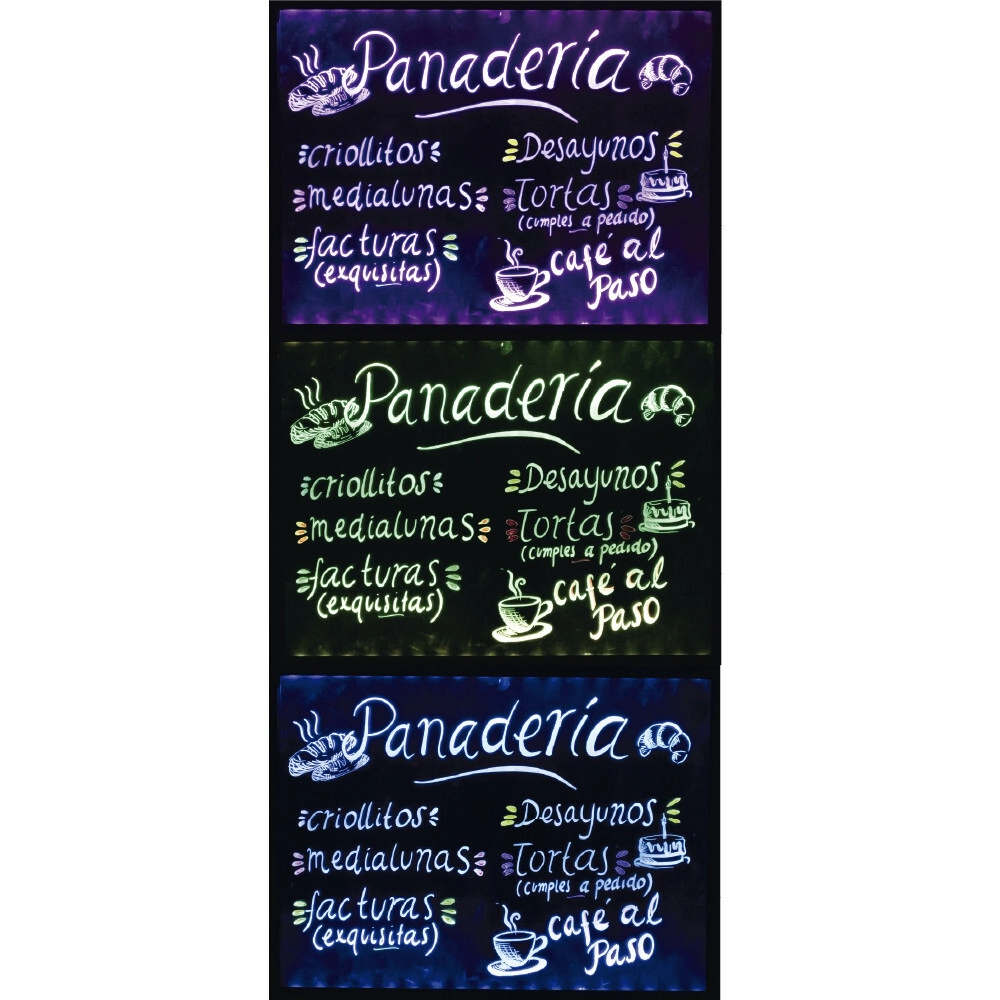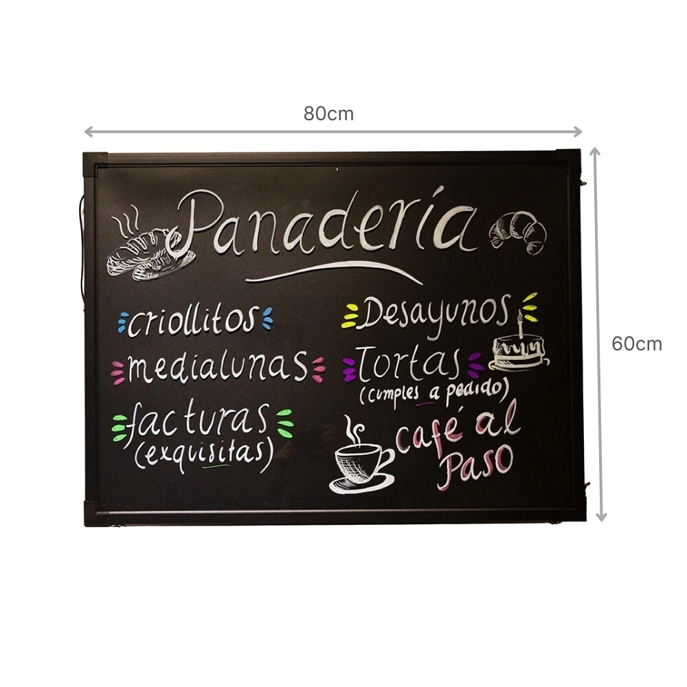 Pizarra LED para colgar, ideal para destacar promociones, menús y mensajes de tu negocio. Funciona con marcadores para pizarra, permitiendo escribir y borrar fácilmente. Cuenta con varios modos de iluminación LED, brindando mayor visibilidad y haciendo que tu cartel llame la atención tanto de día como de noche. Práctica, moderna y perfecta para todo tipo de comercios.